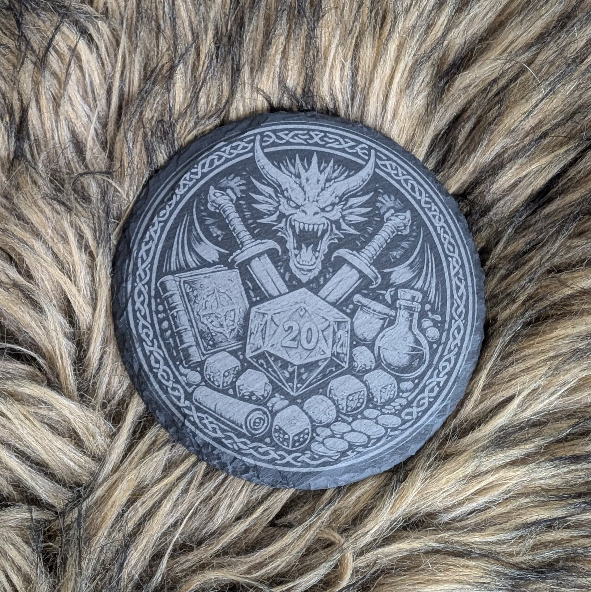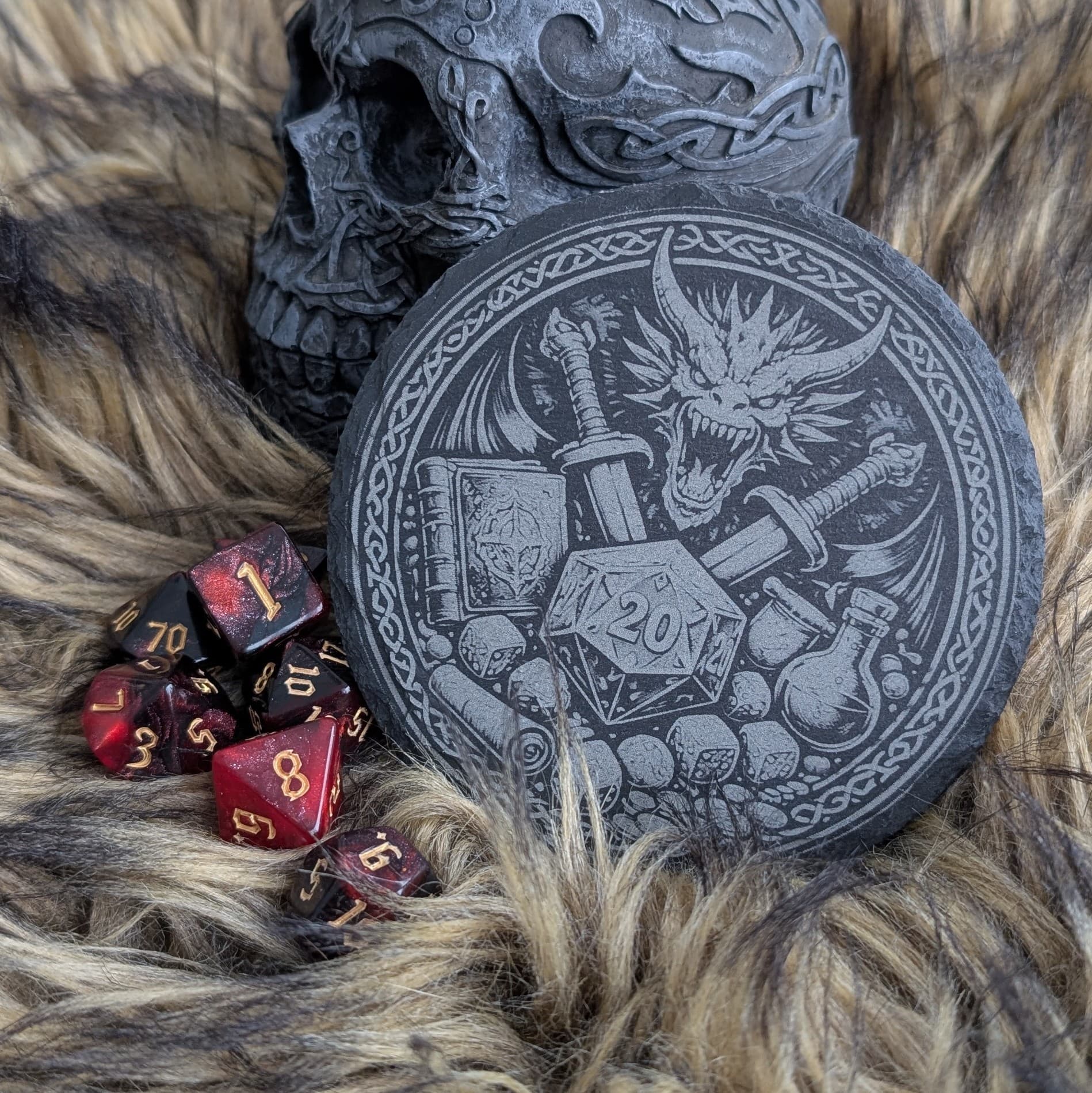 Dieser hochwertige Schieferuntersetzer mit detailreicher Lasergravur ist das ideale Accessoire für gemütliche Pen-&-Paper-Runden. Das Motiv verleiht dem Untersetzer eine besondere Atmosphäre und passt perfekt zu Fantasy- und Rollenspielabenden.